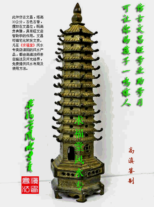 文昌塔,文笔峰,一般金属性的价格比较便宜,但是,你如果家中条件好,建义你用天然水晶制品,因风水上四绿代表文昌位,四绿本是木星,木旺必要用水来生,水晶具有这样的能量,再者水晶本身又具有灵气,能开启人的智慧,其效果是可想而知。此款水文昌塔,其峰如笔状,能量极强,是你首选。